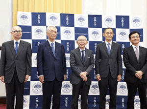 左から、岩井一宏京大医学研究科長、本庶佑氏、柳井正氏、山中伸弥氏、湊長博